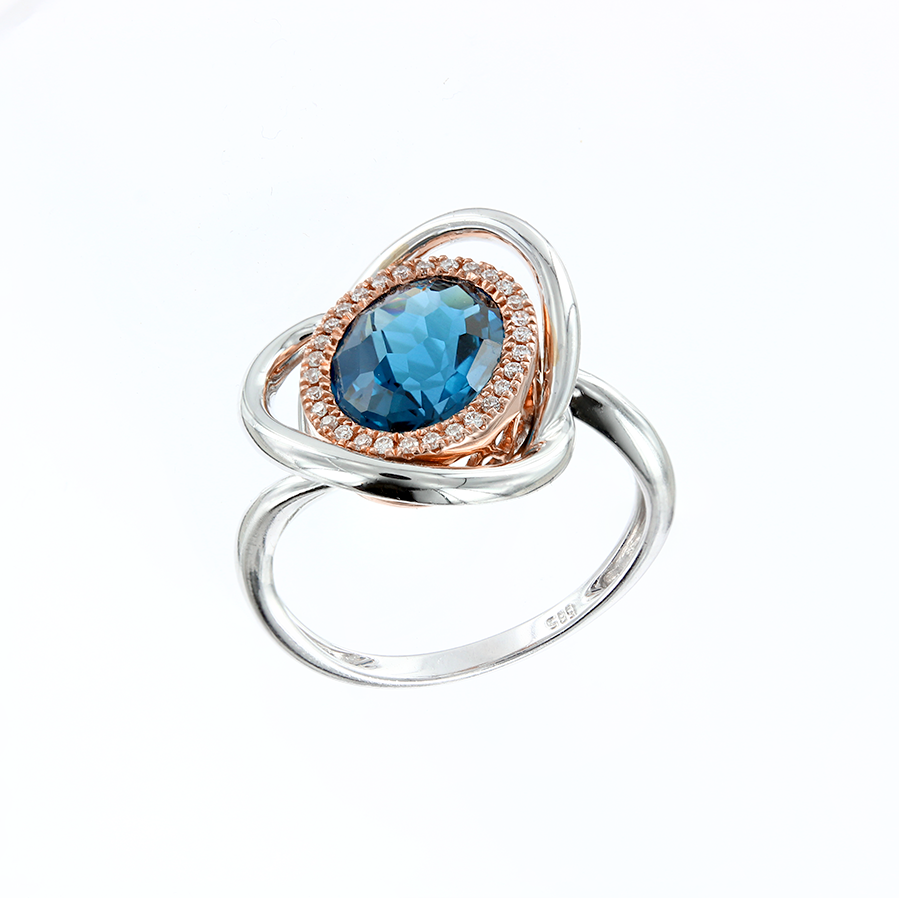 Кольцо женское из белого золота 585 пробы с голубой топаз, бриллианты – прекрасное завершение образа стильной современной женщины, которая любит менять свой стиль, не боясь восторженных взглядов. Утонченное кольцо подходит женщинам любого возраста, и особенно тем, которые ценят уникальный дизайн и утонченность линий. Белое золото это настоящая классика ювелирного производства, которая будет актуальная во все времена. Оно уместно на любой случай жизни – на повседневную носку и на особый выход в свет или дорогой ресторан.