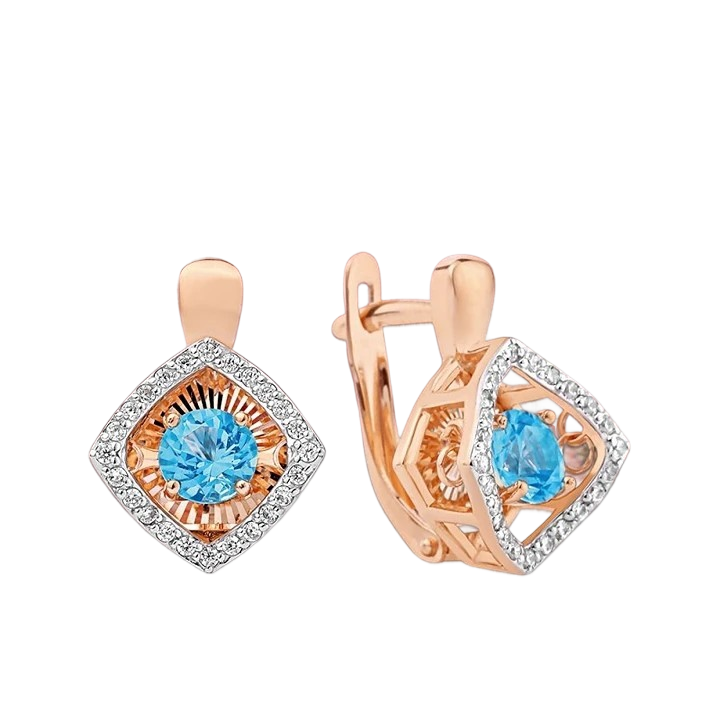 Diese exquisiten Ohrringe sind aus rotem russischen 585er Gold gefertigt und verfügen über zarte tanzende Topassteine und funkelnde Zirkonia, eingefasst in 585er Weißgold. Eine perfekte Wahl, die Ihre Stimmung hebt und Sie unwiderstehlich fühlen lässt.