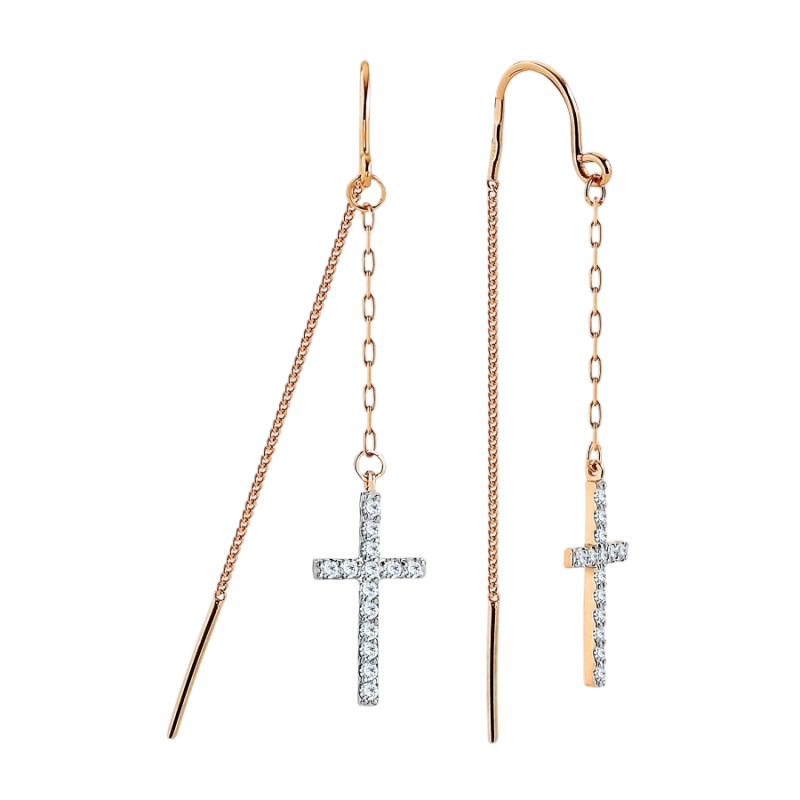 Goldene Fadenohrringe mit Zirkonia-Kreuzen – Russisches 585er Rotgold