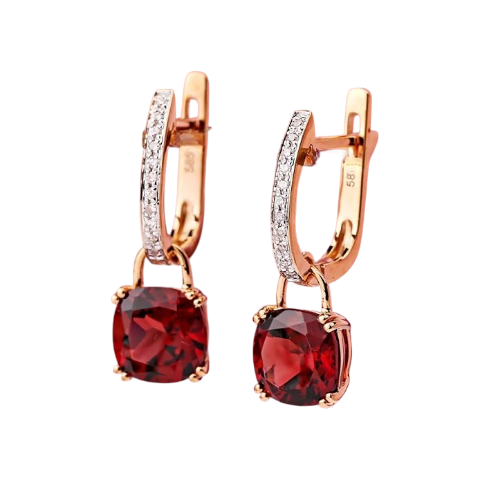 Stilvolle Ohrringe aus 585er Gold – eine Kombination aus Rot- und Weißgold mit funkelnden Zirkoniasteinen und großen Granaten. Dieses Schmuckstück ist die perfekte Ergänzung für Frauen, die es lieben, ihren Stil zu verändern und mit ihrem Look zu experimentieren.