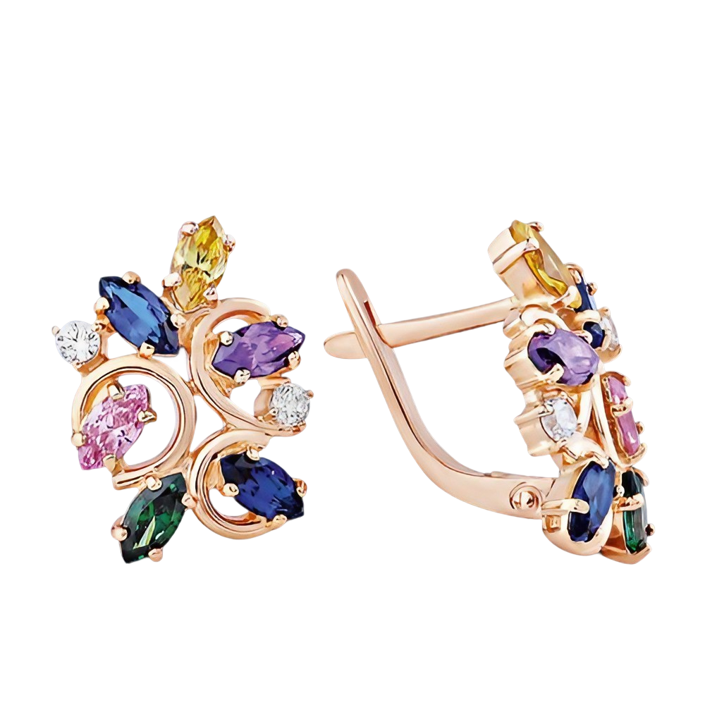 Original Russian 14K Gold Earrings with Blue Spinel and Colorful Cubic Zirconia