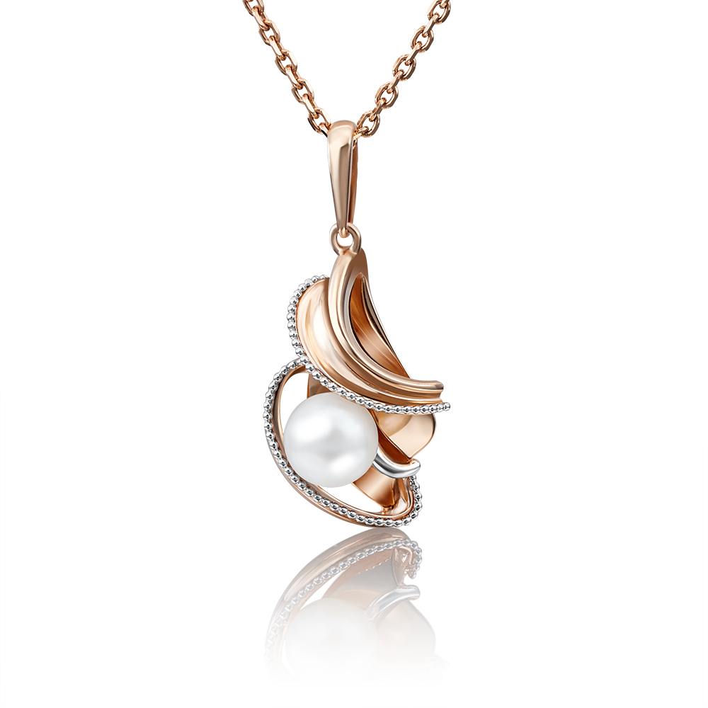 A red gold pendant of 585 assay value with zirconia and natural pearl can add a special charm to any image of a woman or a young girl. And the affordable price allows you to get a whole collection of different models for any occasion. Expressive and sophisticated red gold pendants energize precious metals and embedded stones.