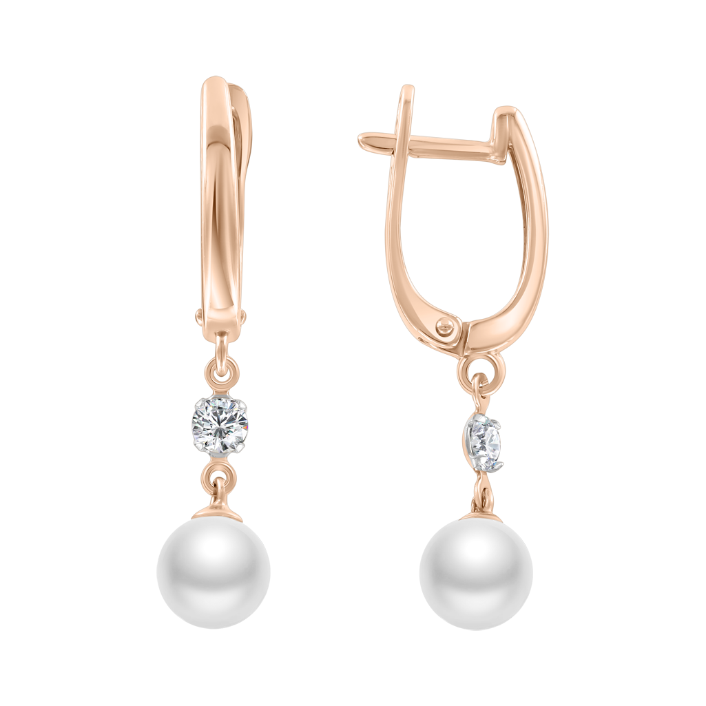 Золотые серьги с жемчугом и фианитами из красного и белого золота 585 пробы