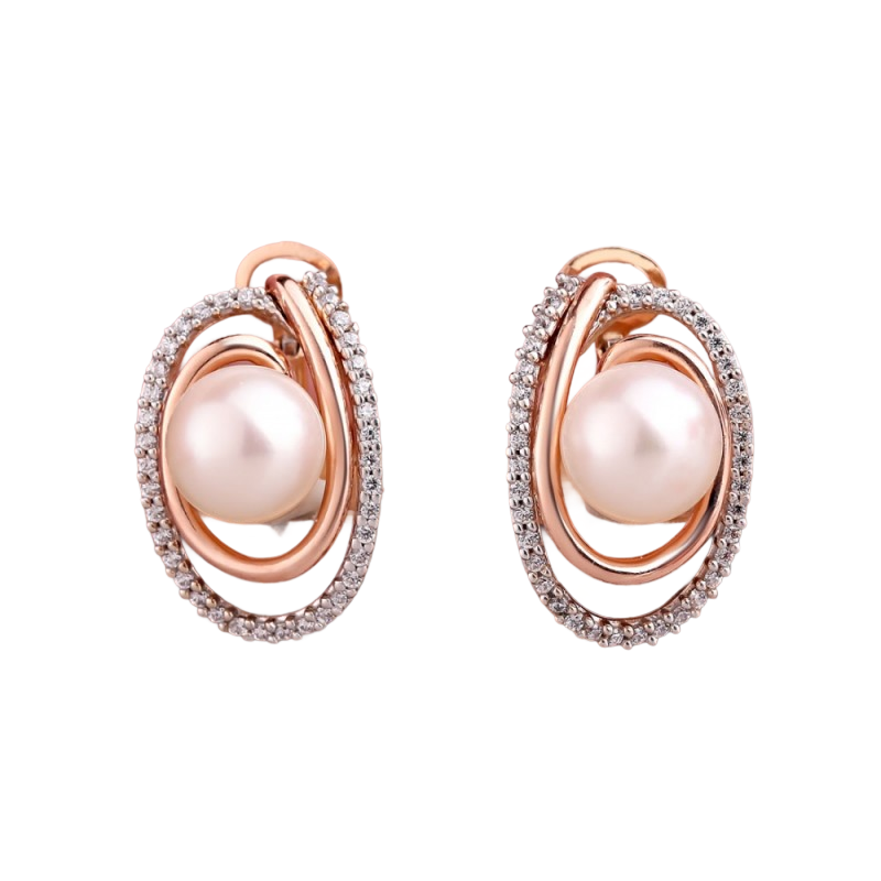 Золотые серьги с жемчугом и фианитами из красного и белого золота 585 пробы
